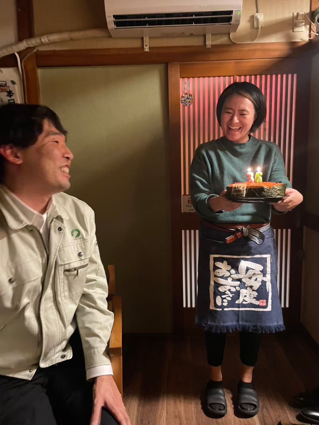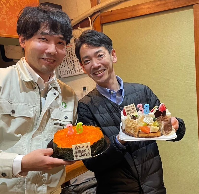 「いやいや、もう大人やし…」とか言いながら、 いざケーキとロウソクが出てくると、みんなニヤける のが総務委員会のいいところ。大川さん特製のいくらおにぎりケーキと山本さんオリジナルケーキで皆テンション爆上がり