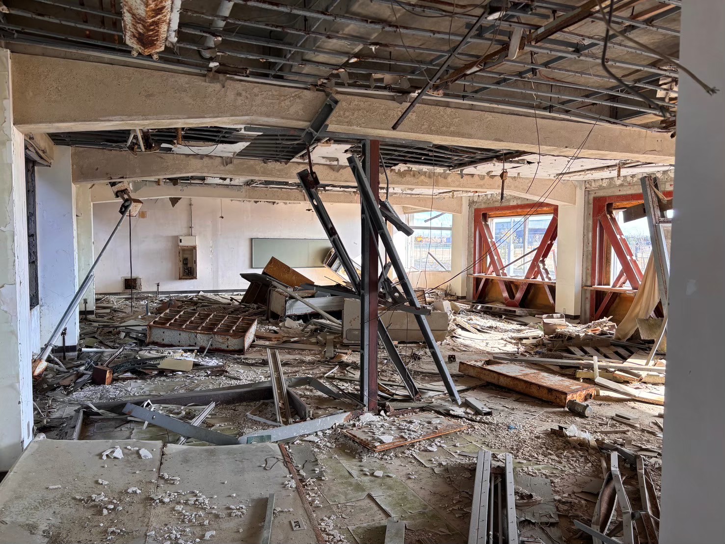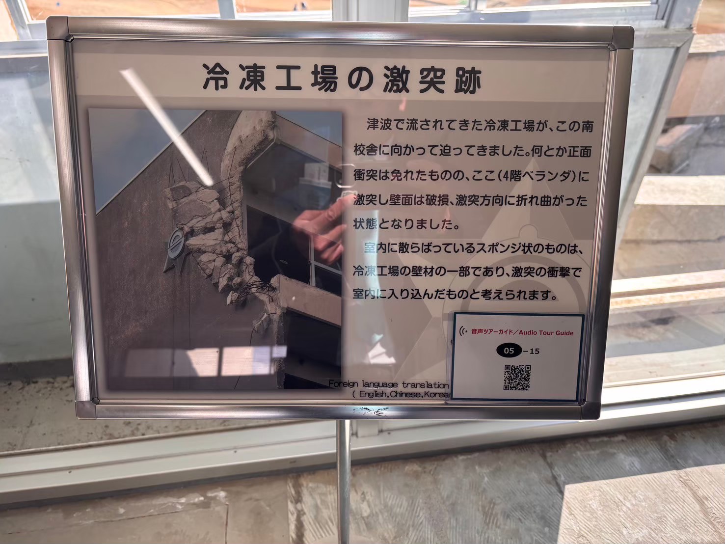 遺構・伝承館は津波で4階まで被災した気仙沼向洋高校の旧校舎を震災遺構としてそのままの姿で保存しており、当時の記録映像や写真等で被害の様子を知ることが出来ます。