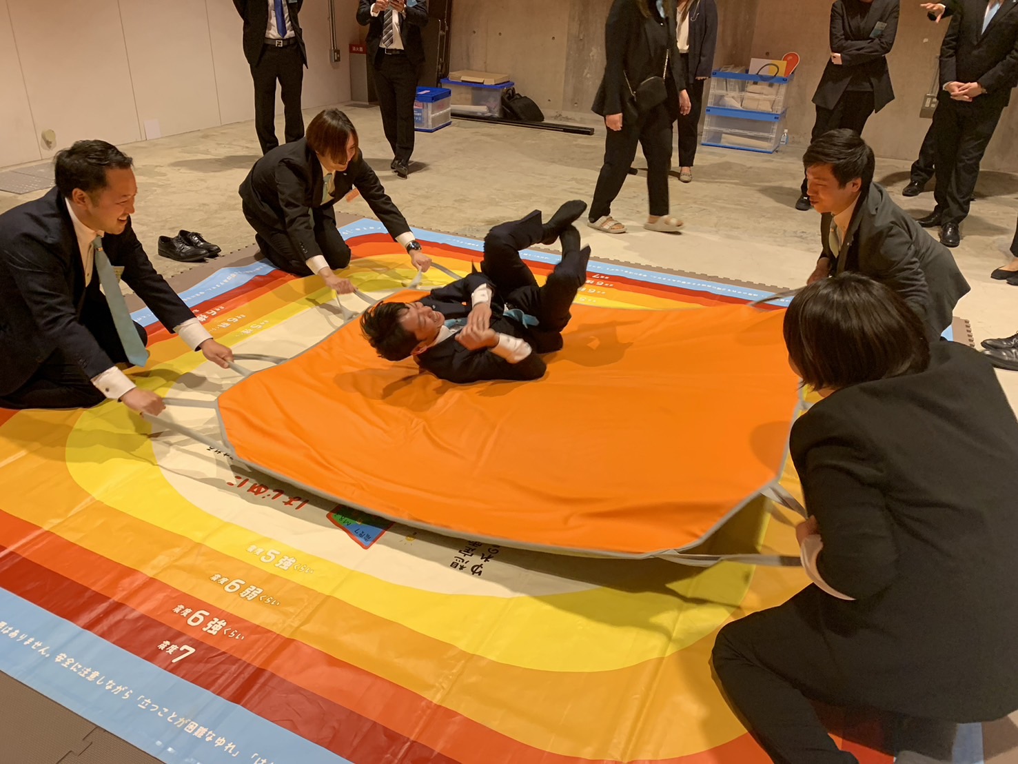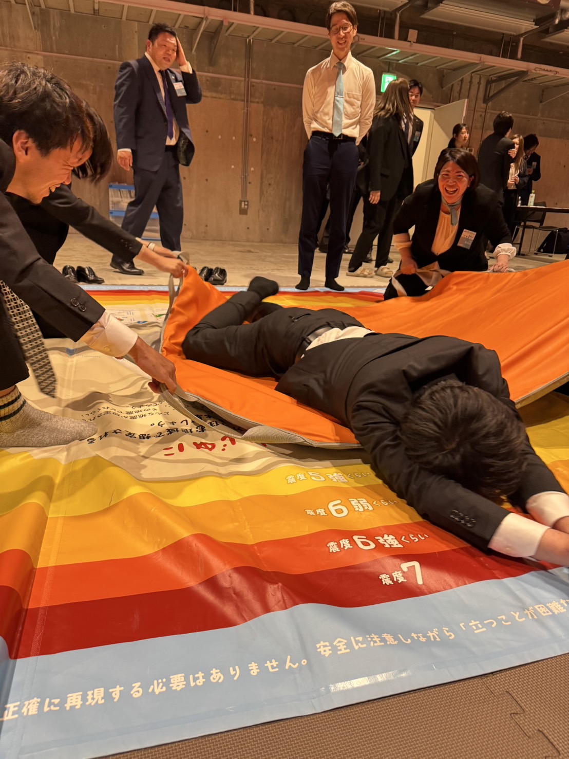 防災体験マット「YURETA」を体感しましたが、揺れると立つことも動くことも出来なくなり、防災について考える機会になりました。見ての通り松浦委員長は転げまわっております。