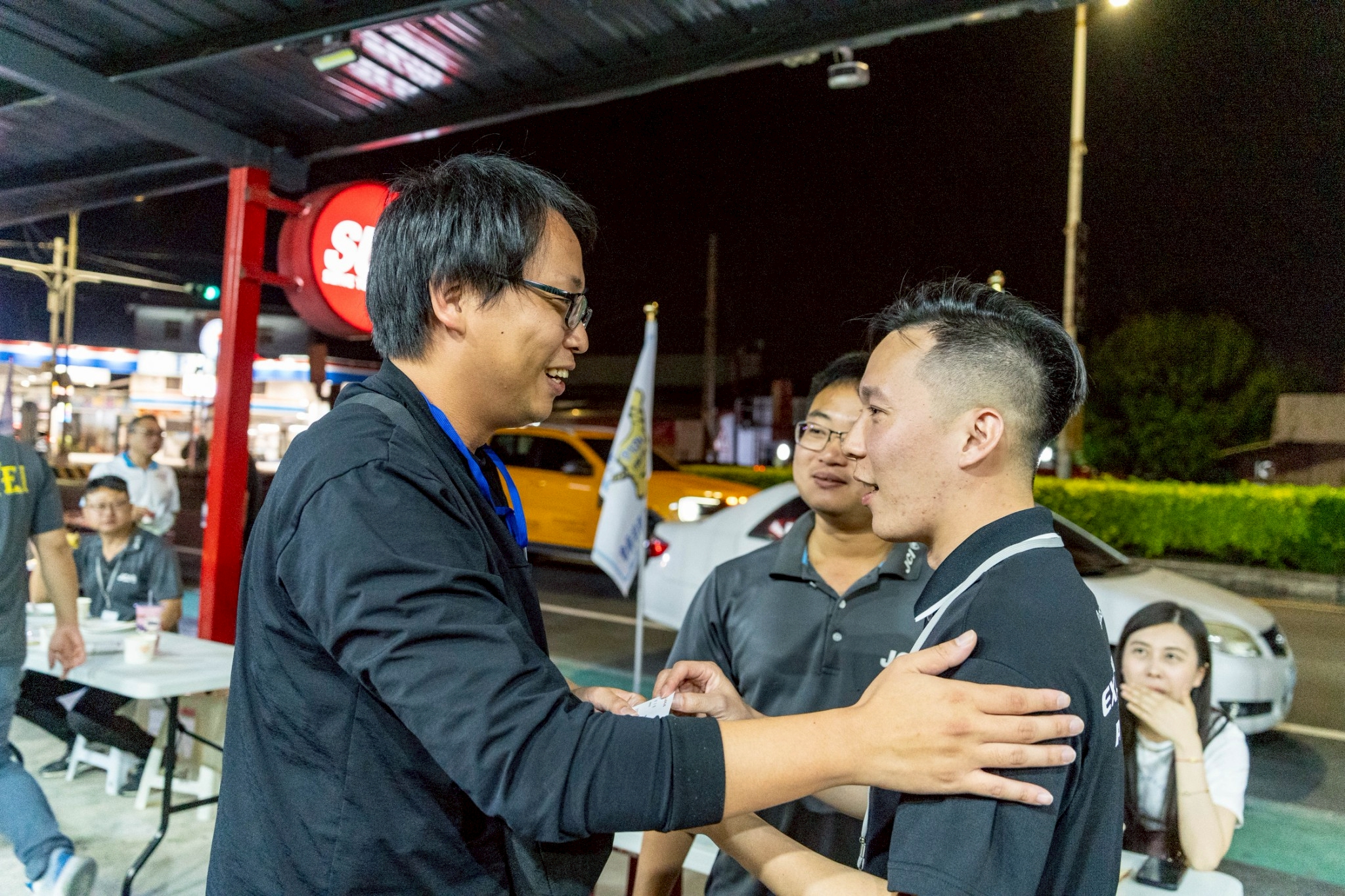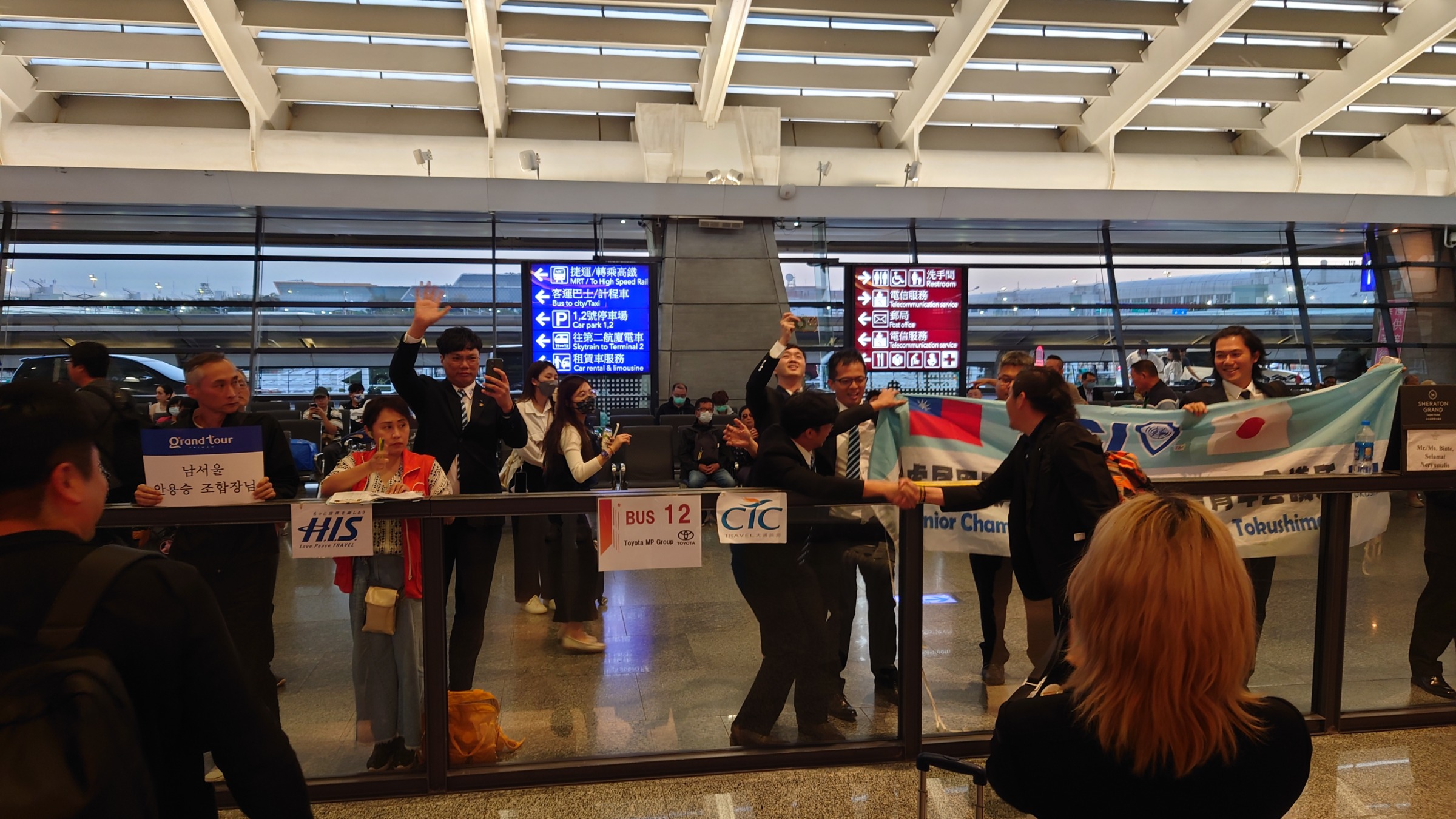 現地時間の18:30ごろ、荷物を取り終え、荷物受け取り口を出たところで、虎尾國際青年商會のメンバーの方々に歓迎をしてもらいました。