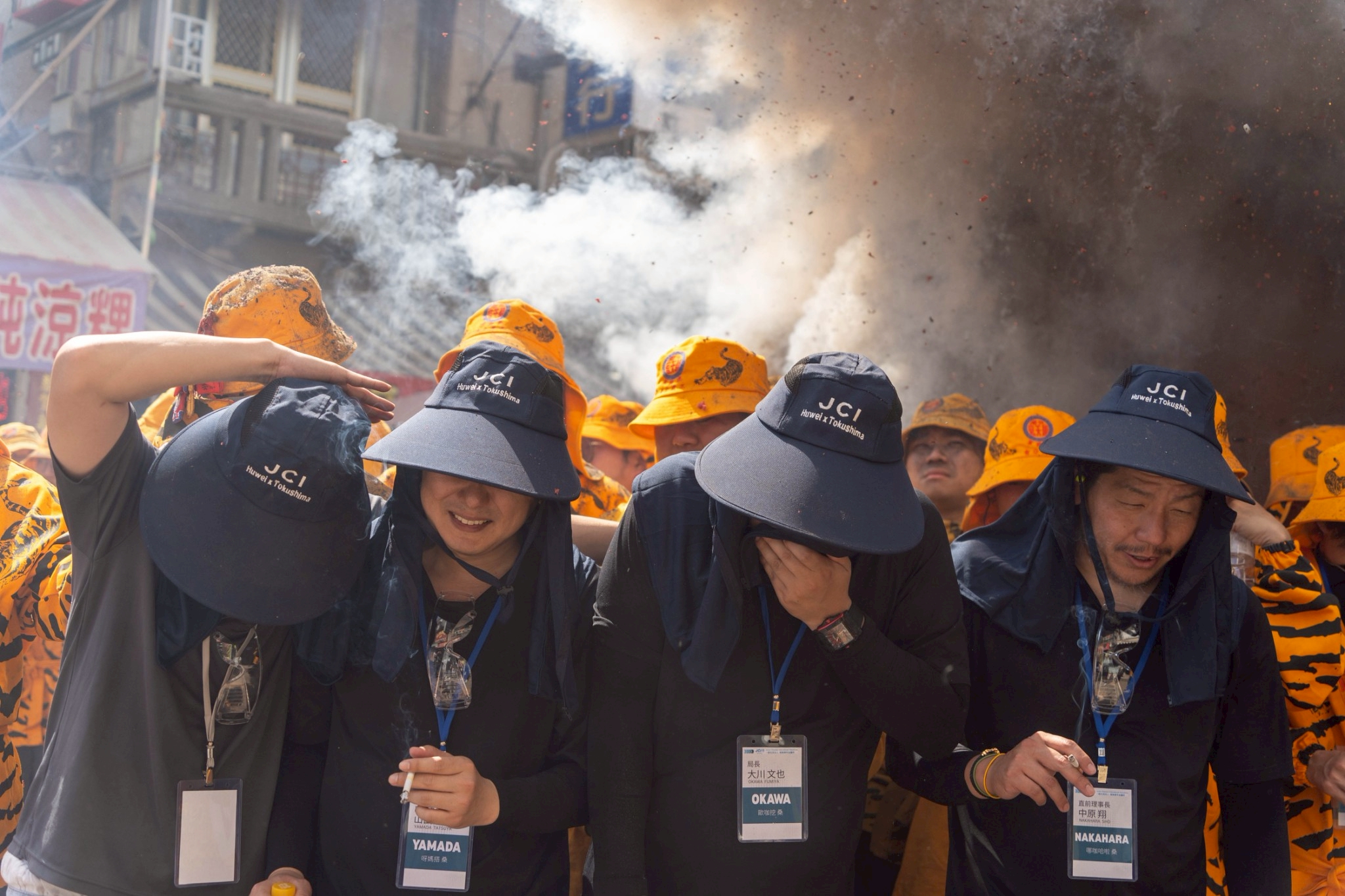爆竹の灰で真っ黒になった参加者の方々