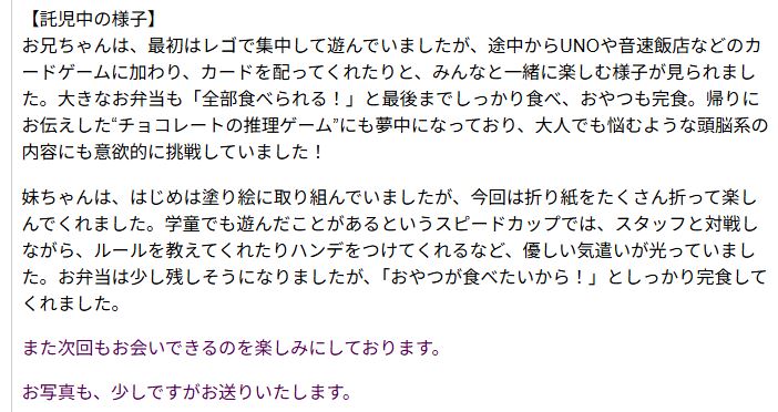 (実際のレポートは、お兄ちゃん・妹ちゃん、と書いてある部分に子供の名前を書いて下さっており、親近感を持って接して下さっていたのですが、子どもに確認したところ、名前が載るのは恥ずかしいとの事で、名前部分は表記を変えることで、掲載の許諾をいただきました!笑 )