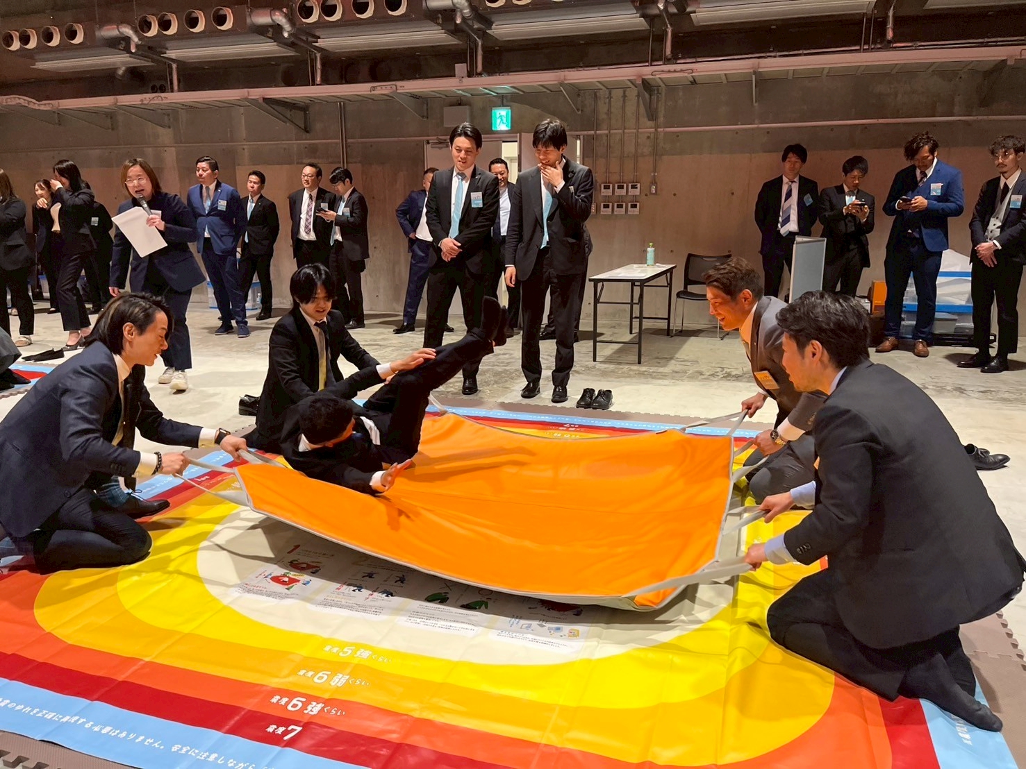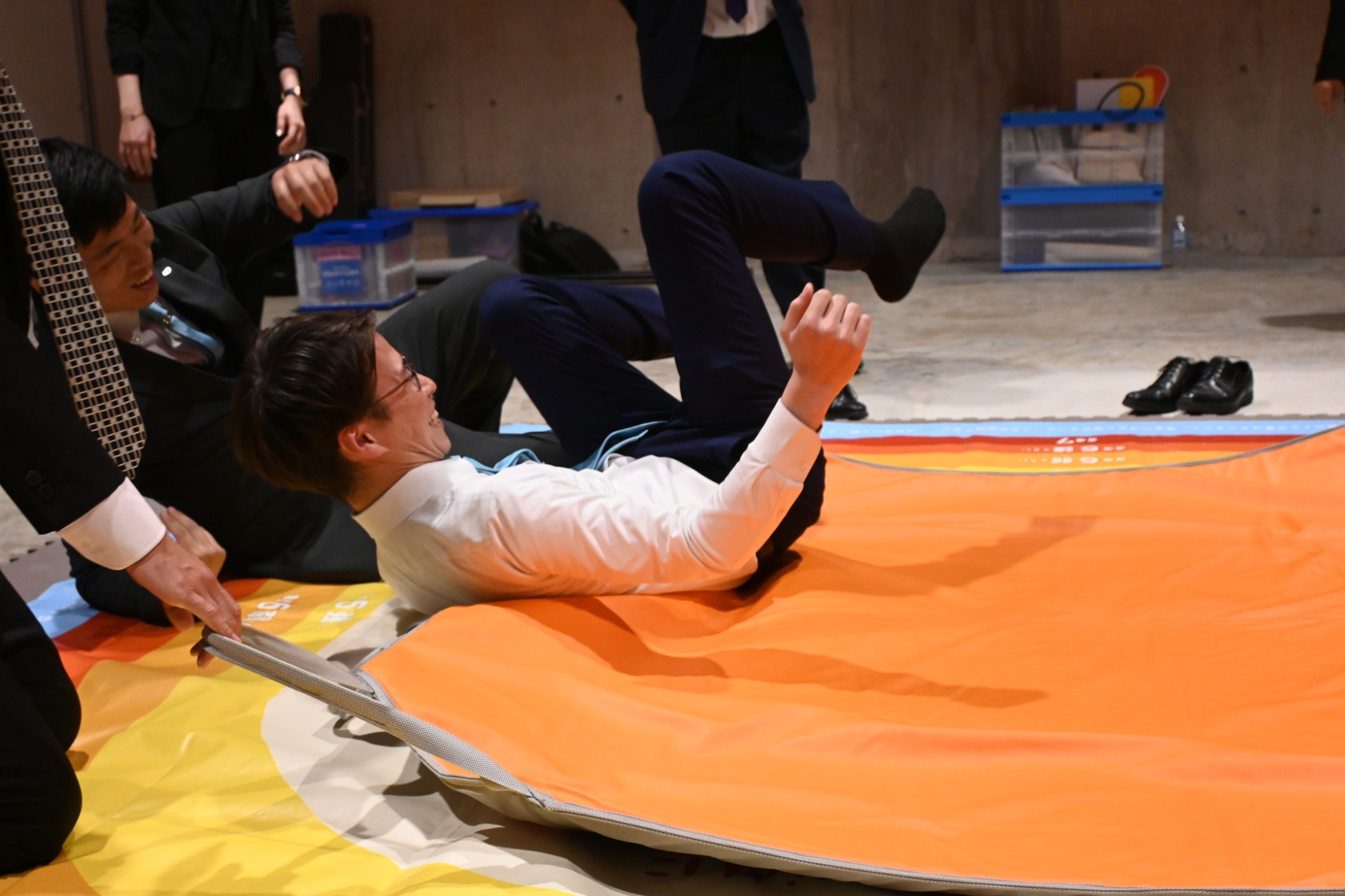 託児会場と例会会場が、同じフロアの隣同士だったこともあり、例会前に少しだけ子どもたちも 揺れ体験マットYURETAの体験をさせてもらいました。