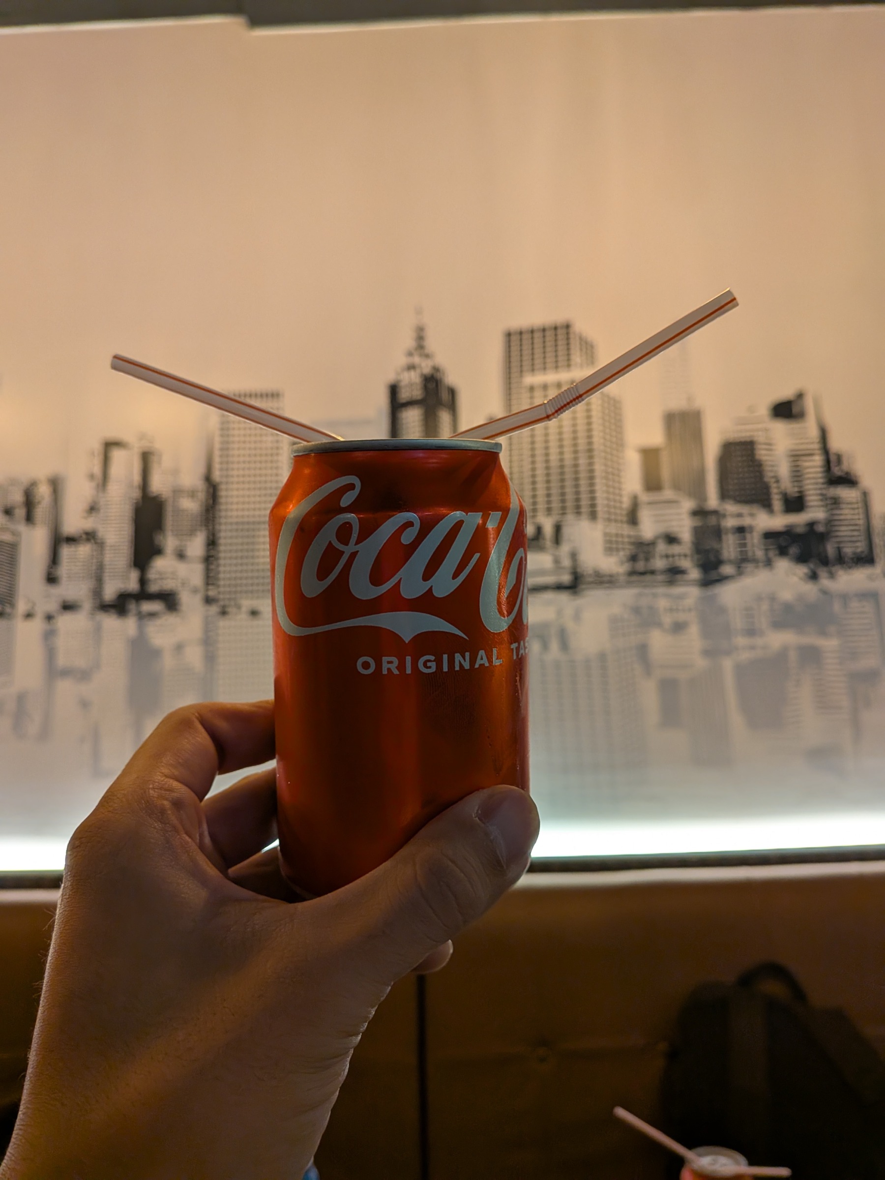 どこでも信頼できる味の一つのコカ・コーラ:ストローがプルタブ挟まれた状態で渡されました。
