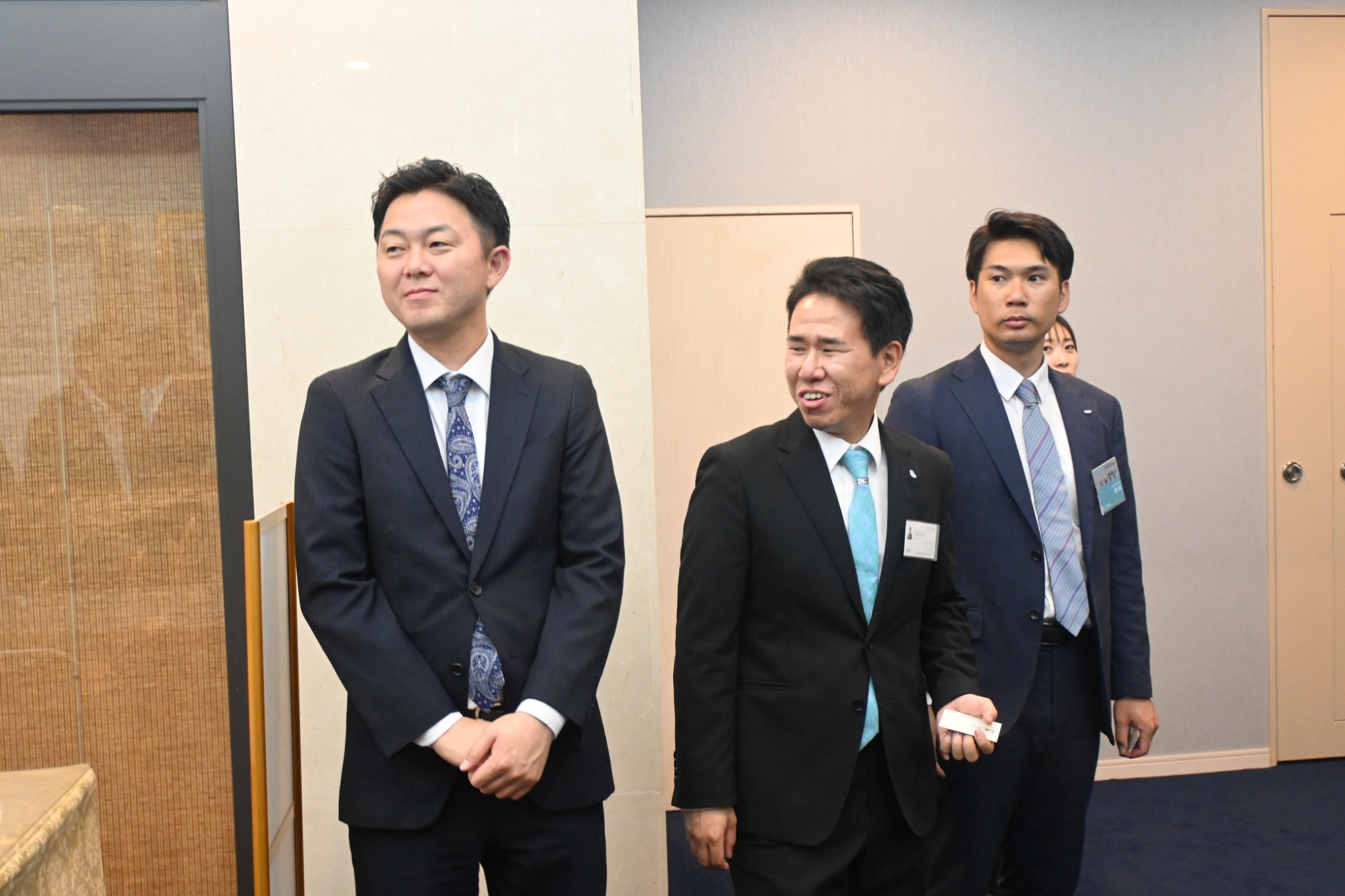 (左)シニアの先輩との名刺交換