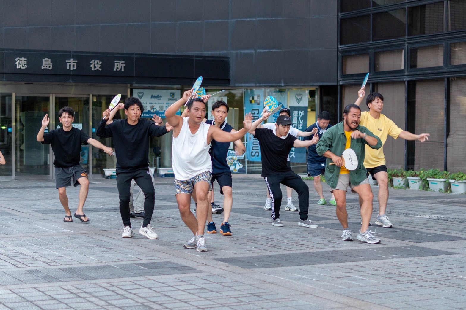 阿波踊りの練習は徳島市役所前にて、扇連の皆さまのご協力のもと行っています。