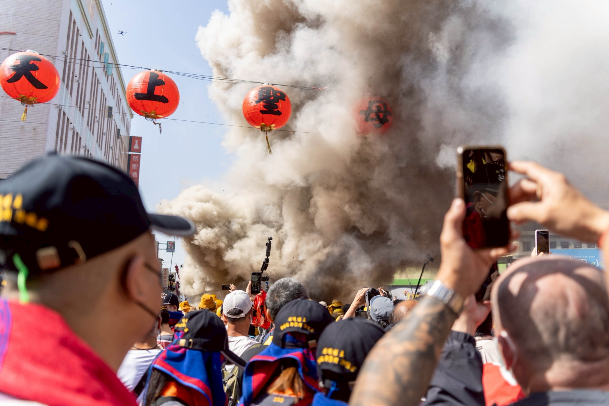 媽祖誕辰は、媽祖という海の女神の誕生日を祝う台湾三大祭りの一つで、街中で爆竹を激しく鳴らし邪気を払う勇壮なお祭りです。